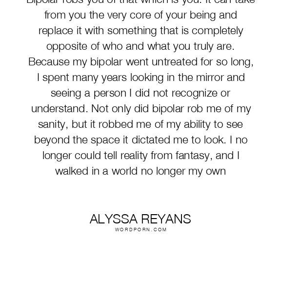 Bipolar robs you of that which is you. It can take from you the very core of your being and replace it with something that is completely opposite of who and what you truly are. Because my bipolar went untreated for so long, I spent many years looking in the mirror and seeing a person I did not recognize or understand. Not only did bipolar rob me of my sanity, but it robbed me of my ability to see beyond the space it dictated me to look. I no longer could tell reality from fantasy, and I walked in a world no longer my own
