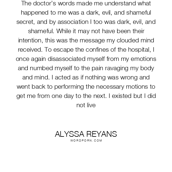 The doctor’s words made me understand what happened to me was a dark, evil, and shameful secret, and by association I too was dark, evil, and shameful. While it may not have been their intention, this was the message my clouded mind received. To escape the confines of the hospital, I once again disassociated myself from my emotions and numbed myself to the pain ravaging my body and mind. I acted as if nothing was wrong and went back to performing the necessary motions to get me from one day to the next. I existed but I did not live