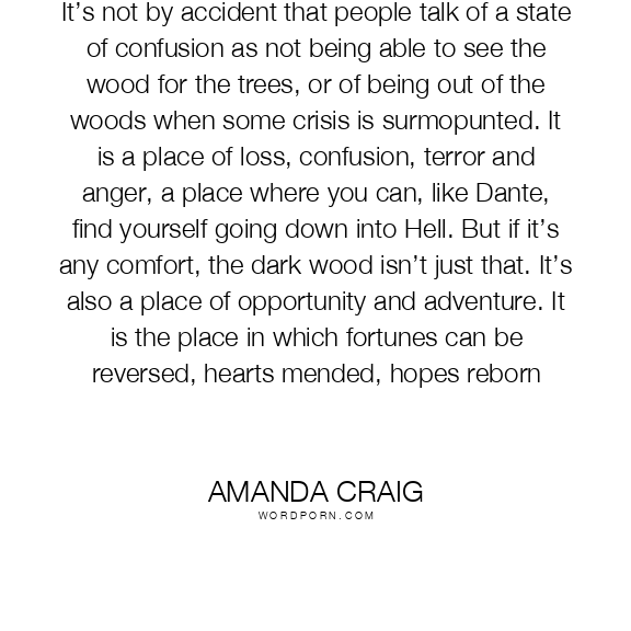 It’s not by accident that people talk of a state of confusion as not being able to see the wood for the trees, or of being out of the woods when some crisis is surmopunted. It is a place of loss, confusion, terror and anger, a place where you can, like Dante, find yourself going down into Hell. But if it’s any comfort, the dark wood isn’t just that. It’s also a place of opportunity and adventure. It is the place in which fortunes can be reversed, hearts mended, hopes reborn