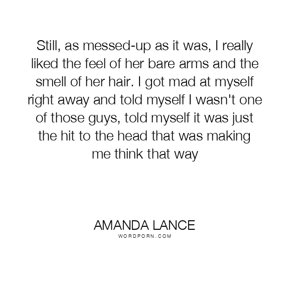 Still, as messed-up as it was, I really liked the feel of her bare arms and the smell of her hair. I got mad at myself right away and told myself I wasn't one of those guys, told myself it was just the hit to the head that was making me think that way