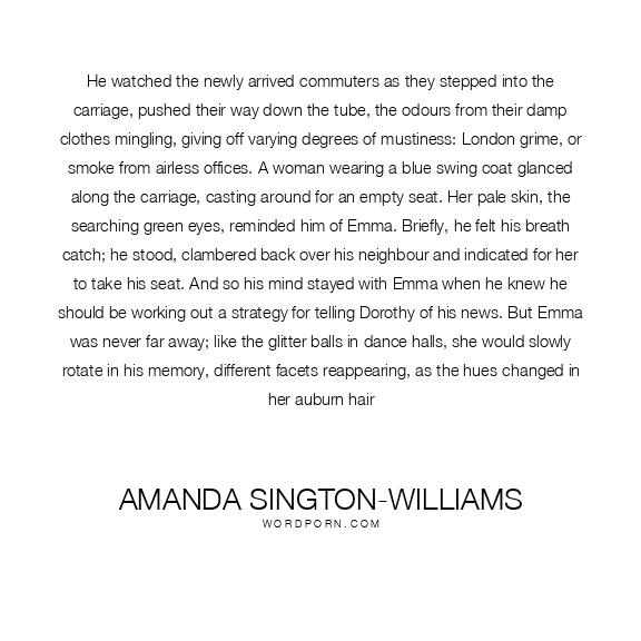 He watched the newly arrived commuters as they stepped into the carriage, pushed their way down the tube, the odours from their damp clothes mingling, giving off varying degrees of mustiness: London grime, or smoke from airless offices. A woman wearing a blue swing coat glanced along the carriage, casting around for an empty seat. Her pale skin, the searching green eyes, reminded him of Emma. Briefly, he felt his breath catch; he stood, clambered back over his neighbour and indicated for her to take his seat. And so his mind stayed with Emma when he knew he should be working out a strategy for telling Dorothy of his news. But Emma was never far away; like the glitter balls in dance halls, she would slowly rotate in his memory, different facets reappearing, as the hues changed in her auburn hair