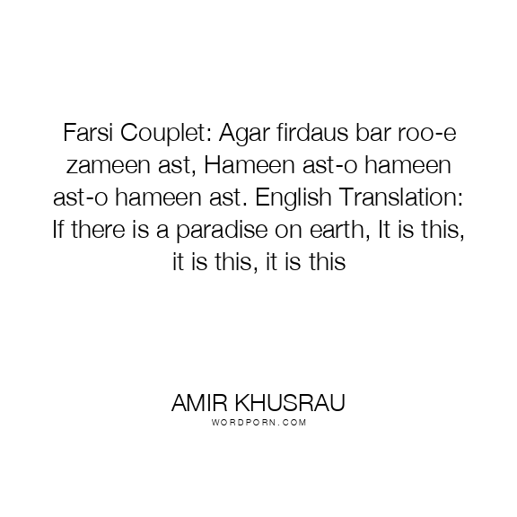 Farsi Couplet: Agar firdaus bar roo-e zameen ast, Hameen ast-o hameen ast-o hameen ast. English Translation: If there is a paradise on earth, It is this, it is this, it is this