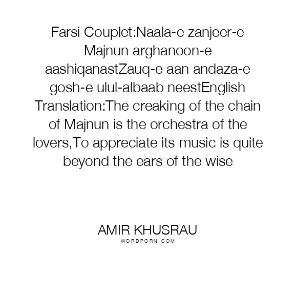Farsi Couplet:Naala-e zanjeer-e Majnun arghanoon-e aashiqanastZauq-e aan andaza-e gosh-e ulul-albaab neestEnglish Translation:The creaking of the chain of Majnun is the orchestra of the lovers,To appreciate its music is quite beyond the ears of the wise