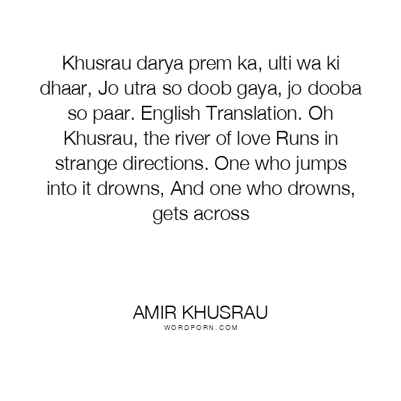 Khusrau darya prem ka, ulti wa ki dhaar, Jo utra so doob gaya, jo dooba so paar. English Translation. Oh Khusrau, the river of love Runs in strange directions. One who jumps into it drowns, And one who drowns, gets across