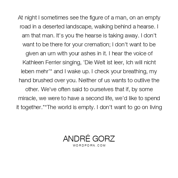 At night I sometimes see the figure of a man, on an empty road in a deserted landscape, walking behind a hearse. I am that man. It's you the hearse is taking away. I don't want to be there for your cremation; I don't want to be given an urn with your ashes in it. I hear the voice of Kathleen Ferrier singing, 'Die Welt ist leer, Ich will nicht leben mehr'* and I wake up. I check your breathing, my hand brushed over you. Neither of us wants to outlive the other. We've often said to ourselves that if, by some miracle, we were to have a second life, we'd like to spend it together."*The world is empty. I don't want to go on living