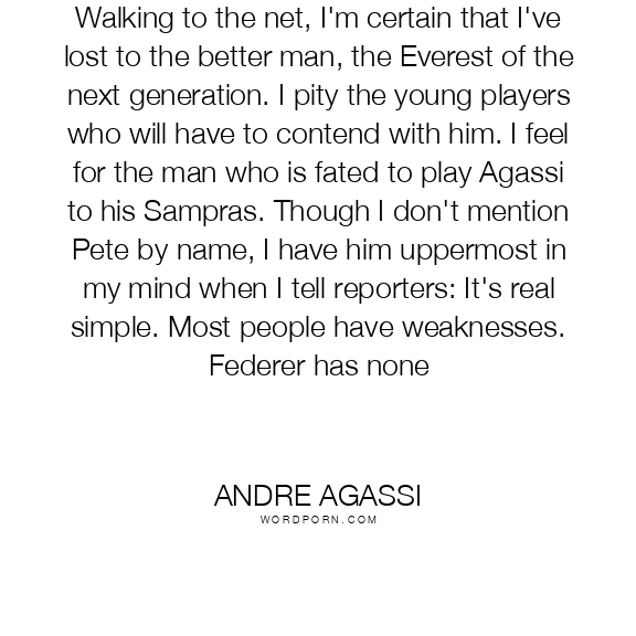 Walking to the net, I'm certain that I've lost to the better man, the Everest of the next generation. I pity the young players who will have to contend with him. I feel for the man who is fated to play Agassi to his Sampras. Though I don't mention Pete by name, I have him uppermost in my mind when I tell reporters: It's real simple. Most people have weaknesses. Federer has none
