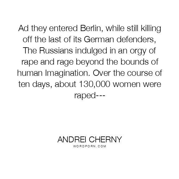 Ad they entered Berlin, while still killing off the last of its German defenders, The Russians indulged in an orgy of rape and rage beyond the bounds of human Imagination. Over the course of ten days, about 130,000 women were raped---