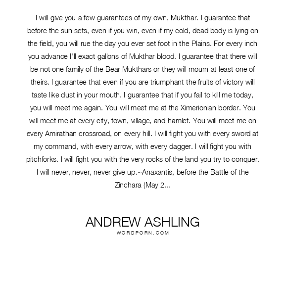 I will give you a few guarantees of my own, Mukthar. I guarantee that before the sun sets, even if you win, even if my cold, dead body is lying on the field, you will rue the day you ever set foot in the Plains. For every inch you advance I'll exact gallons of Mukthar blood. I guarantee that there will be not one family of the Bear Mukthars or they will mourn at least one of theirs. I guarantee that even if you are triumphant the fruits of victory will taste like dust in your mouth. I guarantee that if you fail to kill me today, you will meet me again. You will meet me at the Ximerionian border. You will meet me at every city, town, village, and hamlet. You will meet me on every Amirathan crossroad, on every hill. I will fight you with every sword at my command, with every arrow, with every dagger. I will fight you with pitchforks. I will fight you with the very rocks of the land you try to conquer. I will never, never, never give up.~Anaxantis, before the Battle of the Zinchara (May 29th, 1453 aed)
