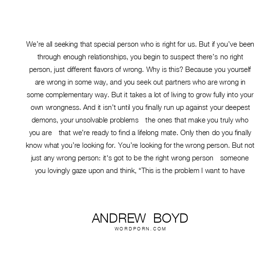 We’re all seeking that special person who is right for us. But if you’ve been through enough relationships, you begin to suspect there’s no right person, just different flavors of wrong. Why is this? Because you yourself are wrong in some way, and you seek out partners who are wrong in some complementary way. But it takes a lot of living to grow fully into your own wrongness. And it isn’t until you finally run up against your deepest demons, your unsolvable problems—the ones that make you truly who you are—that we’re ready to find a lifelong mate. Only then do you finally know what you’re looking for. You’re looking for the wrong person. But not just any wrong person: it's got to be the right wrong person—someone you lovingly gaze upon and think, “This is the problem I want to have