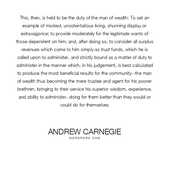 This, then, is held to be the duty of the man of wealth: To set an example of modest, unostentatious living, shunning display or extravagance; to provide moderately for the legitimate wants of those dependent on him; and, after doing so, to consider all surplus revenues which come to him simply as trust funds, which he is called upon to administer, and strictly bound as a matter of duty to administer in the manner which, in his judgement, is best calculated to produce the most beneficial results for the community--the man of wealth thus becoming the mere trustee and agent for his poorer brethren, bringing to their service his superior wisdom, experience, and ability to administer, doing for them better than they would or could do for themselves