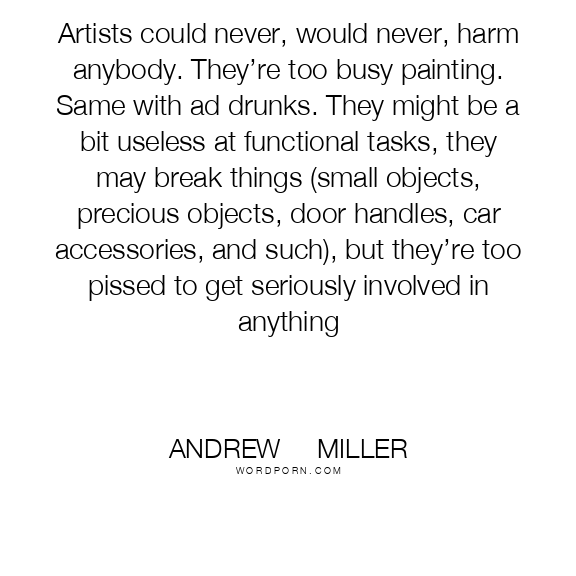 Artists could never, would never, harm anybody. They’re too busy painting. Same with ad drunks. They might be a bit useless at functional tasks, they may break things (small objects, precious objects, door handles, car accessories, and such), but they’re too pissed to get seriously involved in anything