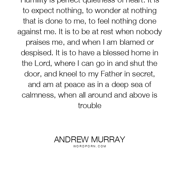 Humility is perfect quietness of heart. It is to expect nothing, to wonder at nothing that is done to me, to feel nothing done against me. It is to be at rest when nobody praises me, and when I am blamed or despised. It is to have a blessed home in the Lord, where I can go in and shut the door, and kneel to my Father in secret, and am at peace as in a deep sea of calmness, when all around and above is trouble