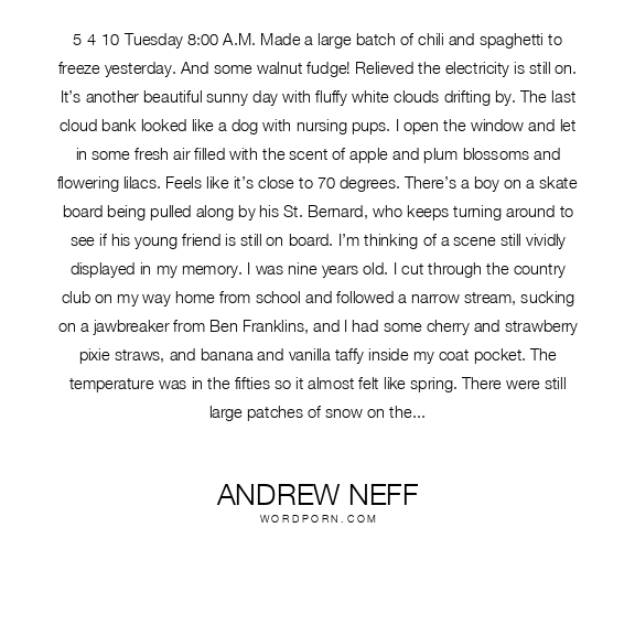 5-4-10 Tuesday 8:00 A.M. Made a large batch of chili and spaghetti to freeze yesterday. And some walnut fudge! Relieved the electricity is still on. It’s another beautiful sunny day with fluffy white clouds drifting by. The last cloud bank looked like a dog with nursing pups. I open the window and let in some fresh air filled with the scent of apple and plum blossoms and flowering lilacs. Feels like it’s close to 70 degrees. There’s a boy on a skate board being pulled along by his St. Bernard, who keeps turning around to see if his young friend is still on board. I’m thinking of a scene still vividly displayed in my memory. I was nine years old. I cut through the country club on my way home from school and followed a narrow stream, sucking on a jawbreaker from Ben Franklins, and I had some cherry and strawberry pixie straws, and banana and vanilla taffy inside my coat pocket. The temperature was in the fifties so it almost felt like spring. There were still large patches of snow on the fairways in the shadows and the ground was soggy from the melt off. Enthralled with the multi-layers of ice, thin sheets and tiny ice sickles gleaming under the afternoon sun, dripping, streaming into the pristine water below, running over the ribbons of green grass, forming miniature rapids and gently flowing rippling waves and all the reflections of a crystal cathedral, merging with the hidden world of a child. Seemingly endless natural sculptures. Then the hollow percussion sounds of the ice thudding, crackling under my feet, breaking off little ice flows carried away into a snow-covered cavern and out the other side of the tunnel. And I followed it all the way to bridge under Maple Road as if I didn't have a care in the world.From - "The Mind Game Company - The Players