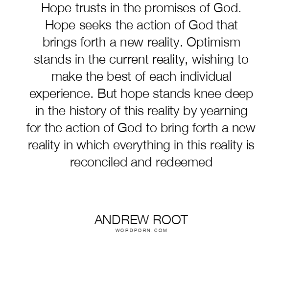 Hope trusts in the promises of God. Hope seeks the action of God that brings forth a new reality. Optimism stands in the current reality, wishing to make the best of each individual experience. But hope stands knee deep in the history of this reality by yearning for the action of God to bring forth a new reality in which everything in this reality is reconciled and redeemed