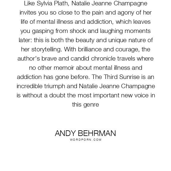 Like Sylvia Plath, Natalie Jeanne Champagne invites you so close to the pain and agony of her life of mental illness and addiction, which leaves you gasping from shock and laughing moments later: this is both the beauty and unique nature of her storytelling. With brilliance and courage, the author's brave and candid chronicle travels where no other memoir about mental illness and addiction has gone before. The Third Sunrise is an incredible triumph and Natalie Jeanne Champagne is without a doubt the most important new voice in this genre