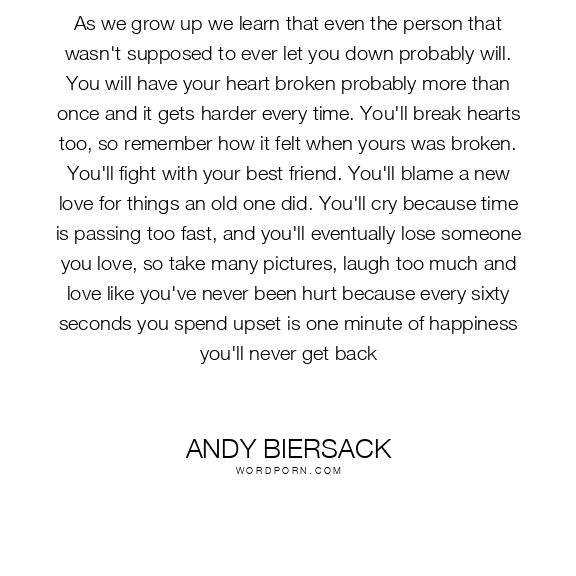 As we grow up we learn that even the person that wasn't supposed to ever let you down probably will. You will have your heart broken probably more than once and it gets harder every time. You'll break hearts too, so remember how it felt when yours was broken. You'll fight with your best friend. You'll blame a new love for things an old one did. You'll cry because time is passing too fast, and you'll eventually lose someone you love, so take many pictures, laugh too much and love like you've never been hurt because every sixty seconds you spend upset is one minute of happiness you'll never get back