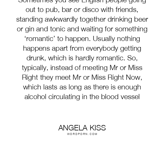 Sometimes you see English people going out to pub, bar or disco with friends, standing awkwardly together drinking beer or gin and tonic and waiting for something ‘romantic’ to happen. Usually nothing happens apart from everybody getting drunk, which is hardly romantic. So, typically, instead of meeting Mr or Miss Right they meet Mr or Miss Right Now, which lasts as long as there is enough alcohol circulating in the blood vessel