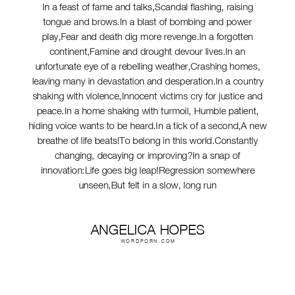 In a feast of fame and talks,Scandal flashing, raising tongue and brows.In a blast of bombing and power play,Fear and death dig more revenge.In a forgotten continent,Famine and drought devour lives.In an unfortunate eye of a rebelling weather,Crashing homes, leaving many in devastation and desperation.In a country shaking with violence,Innocent victims cry for justice and peace.In a home shaking with turmoil, Humble patient, hiding voice wants to be heard.In a tick of a second,A new breathe of life beats!To belong in this world.Constantly changing, decaying or improving?In a snap of innovation:Life goes big leap!Regression somewhere unseen,But felt in a slow, long run