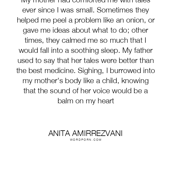 My mother had comforted me with tales ever since I was small. Sometimes they helped me peel a problem like an onion, or gave me ideas about what to do; other times, they calmed me so much that I would fall into a soothing sleep. My father used to say that her tales were better than the best medicine. Sighing, I burrowed into my mother's body like a child, knowing that the sound of her voice would be a balm on my heart