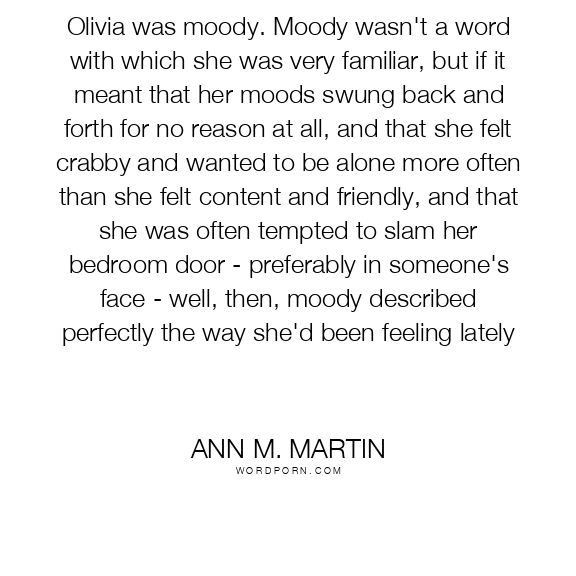 Olivia was moody. Moody wasn't a word with which she was very familiar, but if it meant that her moods swung back and forth for no reason at all, and that she felt crabby and wanted to be alone more often than she felt content and friendly, and that she was often tempted to slam her bedroom door - preferably in someone's face - well, then, moody described perfectly the way she'd been feeling lately