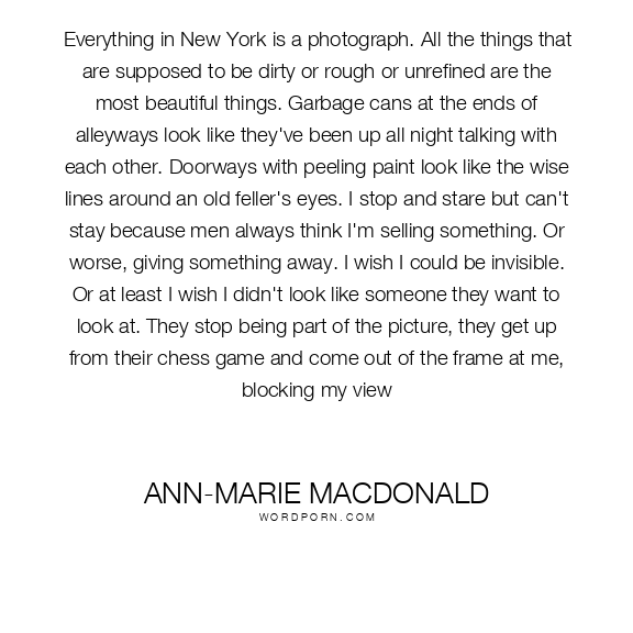 Everything in New York is a photograph. All the things that are supposed to be dirty or rough or unrefined are the most beautiful things. Garbage cans at the ends of alleyways look like they've been up all night talking with each other. Doorways with peeling paint look like the wise lines around an old feller's eyes. I stop and stare but can't stay because men always think I'm selling something. Or worse, giving something away. I wish I could be invisible. Or at least I wish I didn't look like someone they want to look at. They stop being part of the picture, they get up from their chess game and come out of the frame at me, blocking my view