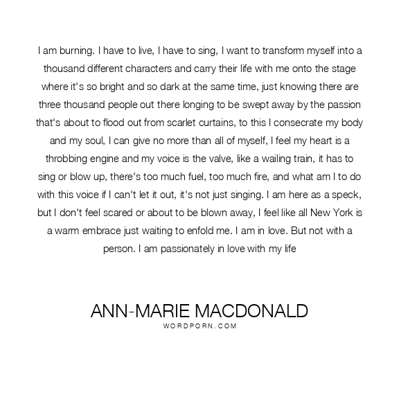 I am burning. I have to live, I have to sing, I want to transform myself into a thousand different characters and carry their life with me onto the stage where it's so bright and so dark at the same time, just knowing there are three thousand people out there longing to be swept away by the passion that's about to flood out from scarlet curtains, to this I consecrate my body and my soul, I can give no more than all of myself, I feel my heart is a throbbing engine and my voice is the valve, like a wailing train, it has to sing or blow up, there's too much fuel, too much fire, and what am I to do with this voice if I can't let it out, it's not just singing. I am here as a speck, but I don't feel scared or about to be blown away, I feel like all New York is a warm embrace just waiting to enfold me. I am in love. But not with a person. I am passionately in love with my life