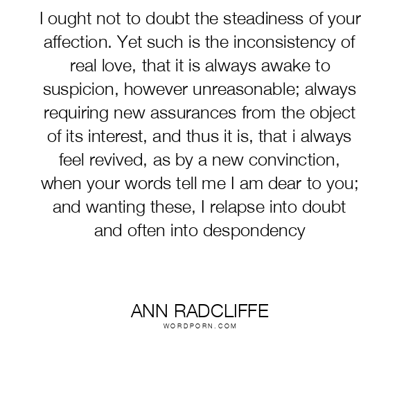 I ought not to doubt the steadiness of your affection. Yet such is the inconsistency of real love, that it is always awake to suspicion, however unreasonable; always requiring new assurances from the object of its interest, and thus it is, that i always feel revived, as by a new convinction, when your words tell me I am dear to you; and wanting these, I relapse into doubt and often into despondency