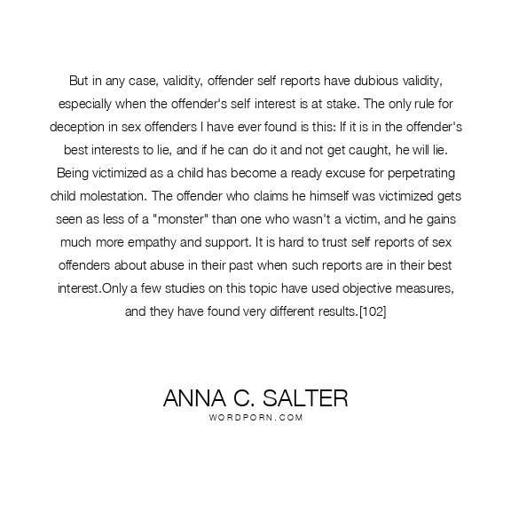 But in any case, validity, offender self-reports have dubious validity, especially when the offender's self-interest is at stake. The only rule for deception in sex offenders I have ever found is this: If it is in the offender's best interests to lie, and if he can do it and not get caught, he will lie. Being victimized as a child has become a ready excuse for perpetrating child molestation. The offender who claims he himself was victimized gets seen as less of a "monster" than one who wasn't a victim, and he gains much more empathy and support. It is hard to trust self-reports of sex offenders about abuse in their past when such reports are in their best interest.Only a few studies on this topic have used objective measures, and they have found very different results.[102]