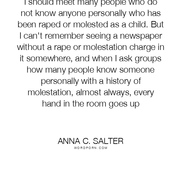 I should meet many people who do not know anyone personally who has been raped or molested as a child. But I can't remember seeing a newspaper without a rape or molestation charge in it somewhere, and when I ask groups how many people know someone personally with a history of molestation, almost always, every hand in the room goes up