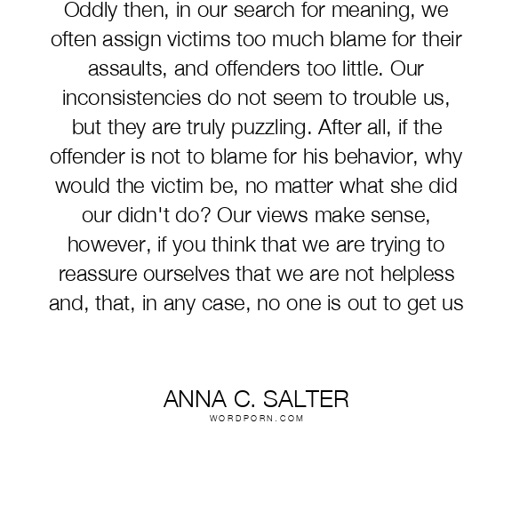 Oddly then, in our search for meaning, we often assign victims too much blame for their assaults, and offenders too little. Our inconsistencies do not seem to trouble us, but they are truly puzzling. After all, if the offender is not to blame for his behavior, why would the victim be, no matter what she did our didn't do? Our views make sense, however, if you think that we are trying to reassure ourselves that we are not helpless and, that, in any case, no one is out to get us