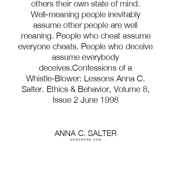 People, in general, tend to project onto others their own state of mind. Well-meaning people inevitably assume other people are well meaning. People who cheat assume everyone cheats. People who deceive assume everybody deceives.Confessions of a Whistle-Blower: Lessons Anna C. Salter. Ethics & Behavior, Volume 8, Issue 2 June 1998