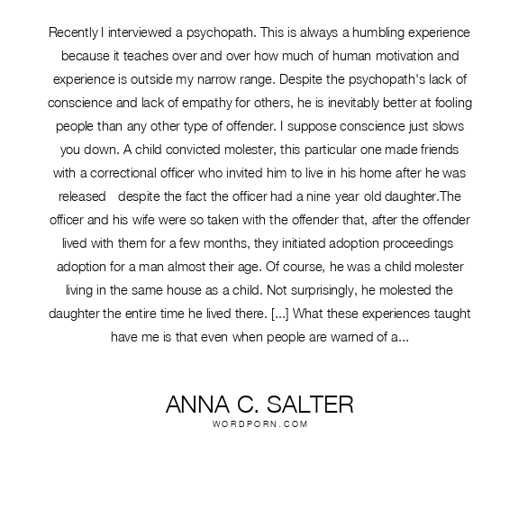 Recently I interviewed a psychopath. This is always a humbling experience because it teaches over and over how much of human motivation and experience is outside my narrow range. Despite the psychopath's lack of conscience and lack of empathy for others, he is inevitably better at fooling people than any other type of offender. I suppose conscience just slows you down. A child convicted molester, this particular one made friends with a correctional officer who invited him to live in his home after he was released - despite the fact the officer had a nine-year-old daughter.The officer and his wife were so taken with the offender that, after the offender lived with them for a few months, they initiated adoption proceedings- adoption for a man almost their age. Of course, he was a child molester living in the same house as a child. Not surprisingly, he molested the daughter the entire time he lived there. [...] What these experiences taught have me is that even when people are warned of a previously founded case of even a conviction, they still routinely underestimate the pathology with which they are dealing