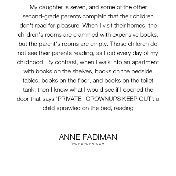 My daughter is seven, and some of the other second-grade parents complain that their children don't read for pleasure. When I visit their homes, the children's rooms are crammed with expensive books, but the parent's rooms are empty. Those children do not see their parents reading, as I did every day of my childhood. By contrast, when I walk into an apartment with books on the shelves, books on the bedside tables, books on the floor, and books on the toilet tank, then I know what I would see if I opened the door that says 'PRIVATE--GROWNUPS KEEP OUT': a child sprawled on the bed, reading