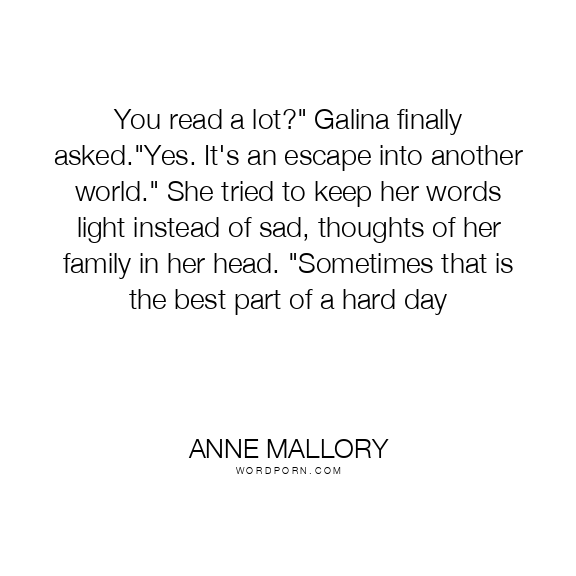 You read a lot?" Galina finally asked."Yes. It's an escape into another world." She tried to keep her words light instead of sad, thoughts of her family in her head. "Sometimes that is the best part of a hard day