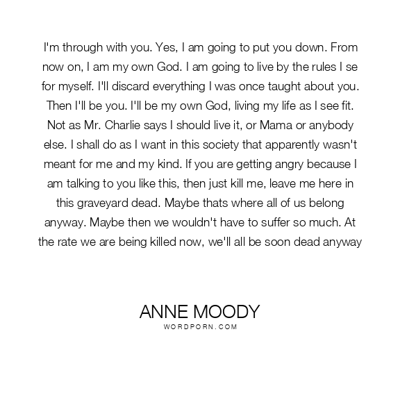 I'm through with you. Yes, I am going to put you down. From now on, I am my own God. I am going to live by the rules I se for myself. I'll discard everything I was once taught about you. Then I'll be you. I'll be my own God, living my life as I see fit. Not as Mr. Charlie says I should live it, or Mama or anybody else. I shall do as I want in this society that apparently wasn't meant for me and my kind. If you are getting angry because I am talking to you like this, then just kill me, leave me here in this graveyard dead. Maybe thats where all of us belong anyway. Maybe then we wouldn't have to suffer so much. At the rate we are being killed now, we'll all be soon dead anyway