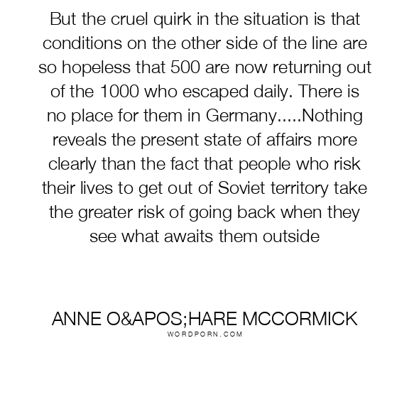 But the cruel quirk in the situation is that conditions on the other side of the line are so hopeless that 500 are now returning out of the 1000 who escaped daily. There is no place for them in Germany.....Nothing reveals the present state of affairs more clearly than the fact that people who risk their lives to get out of Soviet territory take the greater risk of going back when they see what awaits them outside