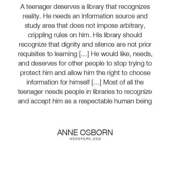 A teenager deserves a library that recognizes reality. He needs an information source and study area that does not impose arbitrary, crippling rules on him. His library should recognize that dignity and silence are not prior requisites to learning […] He would like, needs, and deserves for other people to stop trying to protect him and allow him the right to choose information for himself […] Most of all the teenager needs people in libraries to recognize and accept him as a respectable human being