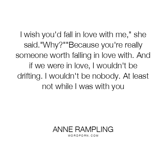 I wish you'd fall in love with me," she said."Why?""Because you're really someone worth falling in love with. And if we were in love, I wouldn't be drifting. I wouldn't be nobody. At least not while I was with you