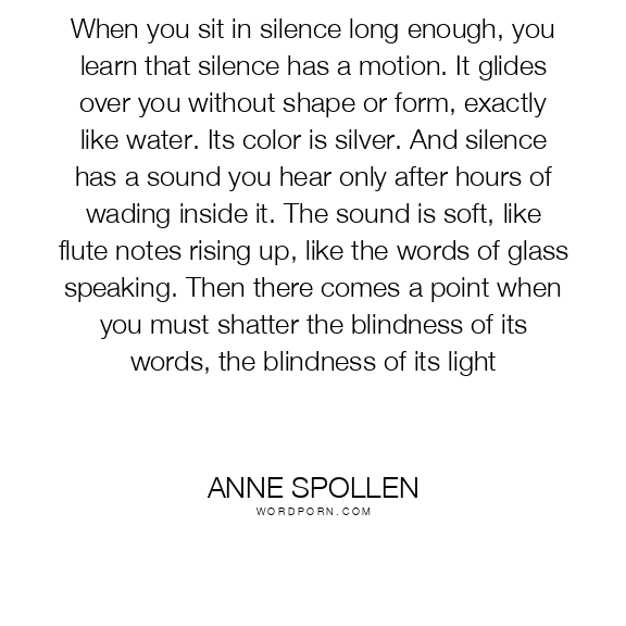 When you sit in silence long enough, you learn that silence has a motion. It glides over you without shape or form, exactly like water. Its color is silver. And silence has a sound you hear only after hours of wading inside it. The sound is soft, like flute notes rising up, like the words of glass speaking. Then there comes a point when you must shatter the blindness of its words, the blindness of its light