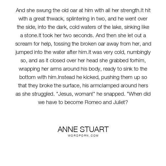 And she swung the old oar at him with all her strength.It hit with a great thwack, splintering in two, and he went over the side, into the dark, cold waters of the lake, sinking like a stone.It took her two seconds. And then she let out a scream for help, tossing the broken oar away from her, and jumped into the water after him.It was very cold, numbingly so, and as it closed over her head she grabbed forhim, wrapping her arms around his body, ready to sink to the bottom with him.Instead he kicked, pushing them up so that they broke the surface, his armclamped around hers as she struggled. "Jesus, woman!" he snapped. "When did we have to become Romeo and Juliet?
