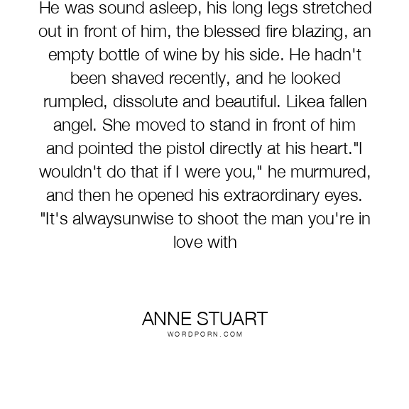 He was sound asleep, his long legs stretched out in front of him, the blessed fire blazing, an empty bottle of wine by his side. He hadn't been shaved recently, and he looked rumpled, dissolute and beautiful. Likea fallen angel. She moved to stand in front of him and pointed the pistol directly at his heart."I wouldn't do that if I were you," he murmured, and then he opened his extraordinary eyes. "It's alwaysunwise to shoot the man you're in love with
