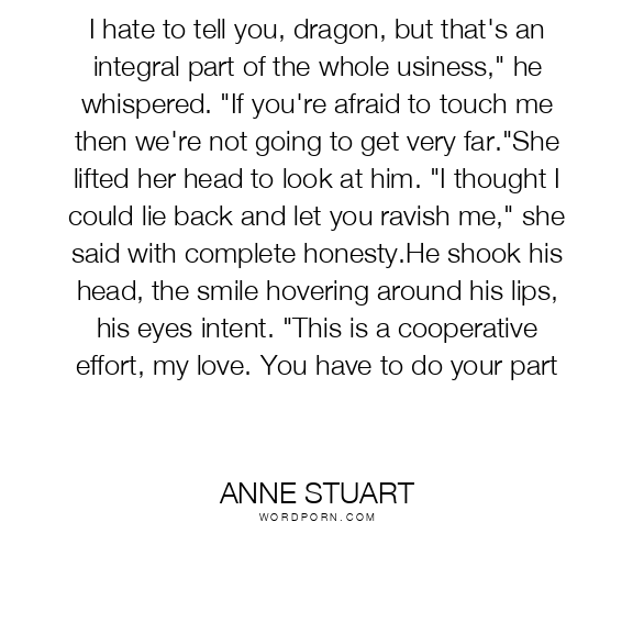 I hate to tell you, dragon, but that's an integral part of the whole usiness," he whispered. "If you're afraid to touch me then we're not going to get very far."She lifted her head to look at him. "I thought I could lie back and let you ravish me," she said with complete honesty.He shook his head, the smile hovering around his lips, his eyes intent. "This is a cooperative effort, my love. You have to do your part