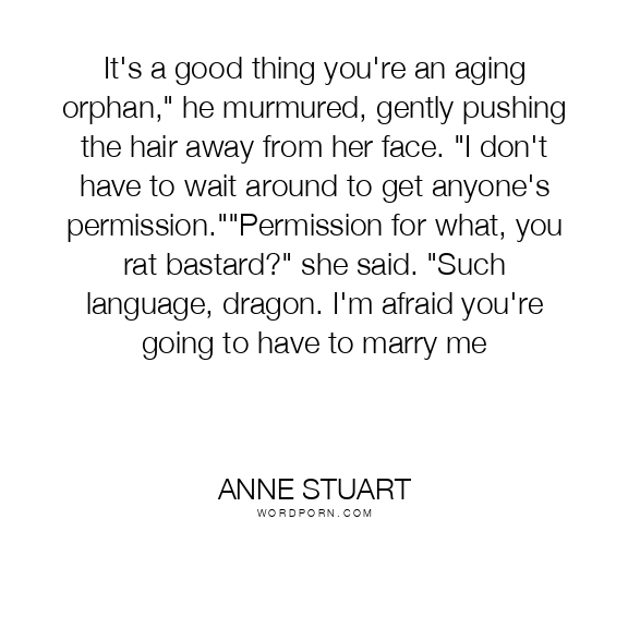 It's a good thing you're an aging orphan," he murmured, gently pushing the hair away from her face. "I don't have to wait around to get anyone's permission.""Permission for what, you rat bastard?" she said. "Such language, dragon. I'm afraid you're going to have to marry me