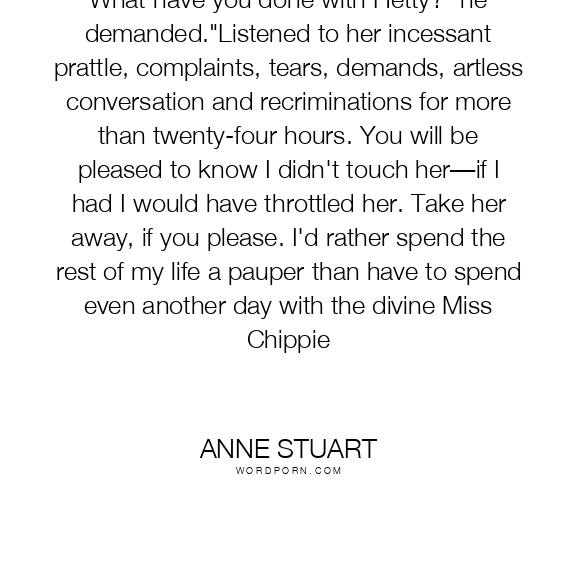What have you done with Hetty?" he demanded."Listened to her incessant prattle, complaints, tears, demands, artless conversation and recriminations for more than twenty-four hours. You will be pleased to know I didn't touch her—if I had I would have throttled her. Take her away, if you please. I'd rather spend the rest of my life a pauper than have to spend even another day with the divine Miss Chippie