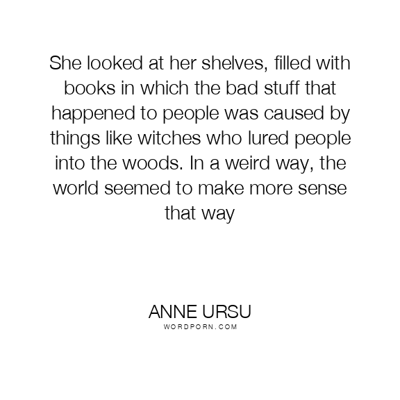 She looked at her shelves, filled with books in which the bad stuff that happened to people was caused by things like witches who lured people into the woods. In a weird way, the world seemed to make more sense that way