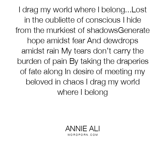I drag my world where I belong...Lost in the oubliette of conscious I hide from the murkiest of shadowsGenerate hope amidst fear And dewdrops amidst rain My tears don’t carry the burden of pain By taking the draperies of fate along In desire of meeting my beloved in chaos I drag my world where I belong