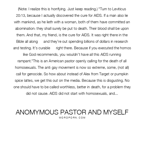 (Note: I realize this is horrifying. Just keep reading.) "Turn to Leviticus 20:13, because I actually discovered the cure for AIDS. If a man also lie with mankind, as he lieth with a woman, both of them have committed an abomination: they shall surely be put to death. Their blood shall be upon them. And that, my friend, is the cure for AIDS. It was right there in the Bible all along — and they’re out spending billions of dollars in research and testing. It’s curable — right there. Because if you executed the homos like God recommends, you wouldn’t have all this AIDS running rampant."This is an American pastor openly calling for the death of all homosexuals. The anti-gay movement is now so extreme, some, (not all) call for genocide. So how about instead of Alex from Target or pumpkin spice lattes, we get this out on the media. Because this is disgusting. No one should have to be called worthless, better in death, for a problem they did not cause. AIDS did not start with homosexuals, and it's not going to end with them. The only thing that has to end is hate like this