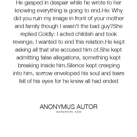 He gasped in despair while he wrote to her knowing everything is going to end.He: Why did you ruin my image in front of your mother and family though I wasn't the bad guy?She replied Coldly: I acted childish and took revenge, I wanted to end this relation.He kept asking all that she accused him of.She kept admitting false allegations, something kept breaking inside him.Silence kept creeping into him, sorrow enveloped his soul and tears fell of his eyes for he knew all had ended
