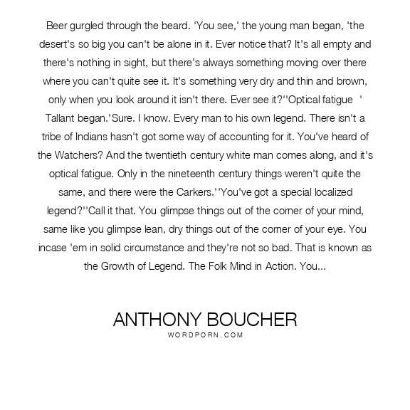 Beer gurgled through the beard. 'You see,' the young man began, 'the desert's so big you can't be alone in it. Ever notice that? It's all empty and there's nothing in sight, but there's always something moving over there where you can't quite see it. It's something very dry and thin and brown, only when you look around it isn't there. Ever see it?''Optical fatigue -' Tallant began.'Sure. I know. Every man to his own legend. There isn't a tribe of Indians hasn't got some way of accounting for it. You've heard of the Watchers? And the twentieth-century white man comes along, and it's optical fatigue. Only in the nineteenth century things weren't quite the same, and there were the Carkers.''You've got a special localized legend?''Call it that. You glimpse things out of the corner of your mind, same like you glimpse lean, dry things out of the corner of your eye. You incase 'em in solid circumstance and they're not so bad. That is known as the Growth of Legend. The Folk Mind in Action. You take the Carkers and the things you don't quite see and put 'em together. And they bite.'Tallant wondered how long that beard had been absorbing beer. 'And what were the Carkers?' he prompted politely.'Ever hear of Sawney Bean? Scotland - reign of James the First or maybe the Sixth, though I think Roughead's wrong on that for once. Or let's be more modern - ever hear of the Benders? Kansas in the 1870's? No? Ever hear of Procrustes? Or Polyphemus? Or Fee-fi-fo-fum?'There are ogres, you know. They're no legend. They're fact, they are. The inn where nine guests left for every ten that arrived, the mountain cabin that sheltered travelers from the snow, sheltered them all winter till the melting spring uncovered their bones, the lonely stretches of road that so many passengers traveled halfway - you'll find 'em everywhere. All over Europe and pretty much in this country too before communications became what they are. Profitable business. And it wasn't just the profit. The Benders made money, sure; but that wasn't why they killed all their victims as carefully as a kosher butcher. Sawney Bean got so he didn't give a damn about the profit; he just needed to lay in more meat for the winter.'And think of the chances you'd have at an oasis.''So these Carkers of yours were, as you call them, ogres?''Carkers, ogres - maybe they were Benders. The Benders were never seen alive, you know, after the townspeople found those curiously butchered bodies. There's a rumor they got this far West. And the time checks pretty well. There wasn't any town here in the 80s. Just a couple of Indian families - last of a dying tribe living on at the oasis. They vanished after the Carkers moved in. That's not so surprising. The white race is a sort of super-ogre, anyway. Nobody worried about them. But they used to worry about why so many travelers never got across this stretch of desert. The travelers used to stop over at the Carkers, you see, and somehow they often never got any further. Their wagons'd be found maybe fifteen miles beyond in the desert. Sometimes they found the bones, too, parched and white. Gnawed-looking, they said sometimes.''And nobody ever did anything about these Carkers?''Oh, sure. We didn't have King James the Sixth - only I still think it was the First - to ride up on a great white horse for a gesture, but twice there were Army detachments came here and wiped them all out.''Twice? One wiping-out would do for most families.'Tallant smiled at the beery confusion of the young man's speech.'Uh-huh, That was no slip. They wiped out the Carkers twice because you see once didn't do any good. They wiped 'em out and still travelers vanished and still there were white gnawed bones. So they wiped 'em out again. After that they gave up, and people detoured the oasis.("They Bite")