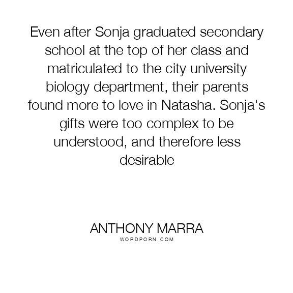 Even after Sonja graduated secondary school at the top of her class and matriculated to the city university biology department, their parents found more to love in Natasha. Sonja's gifts were too complex to be understood, and therefore less desirable